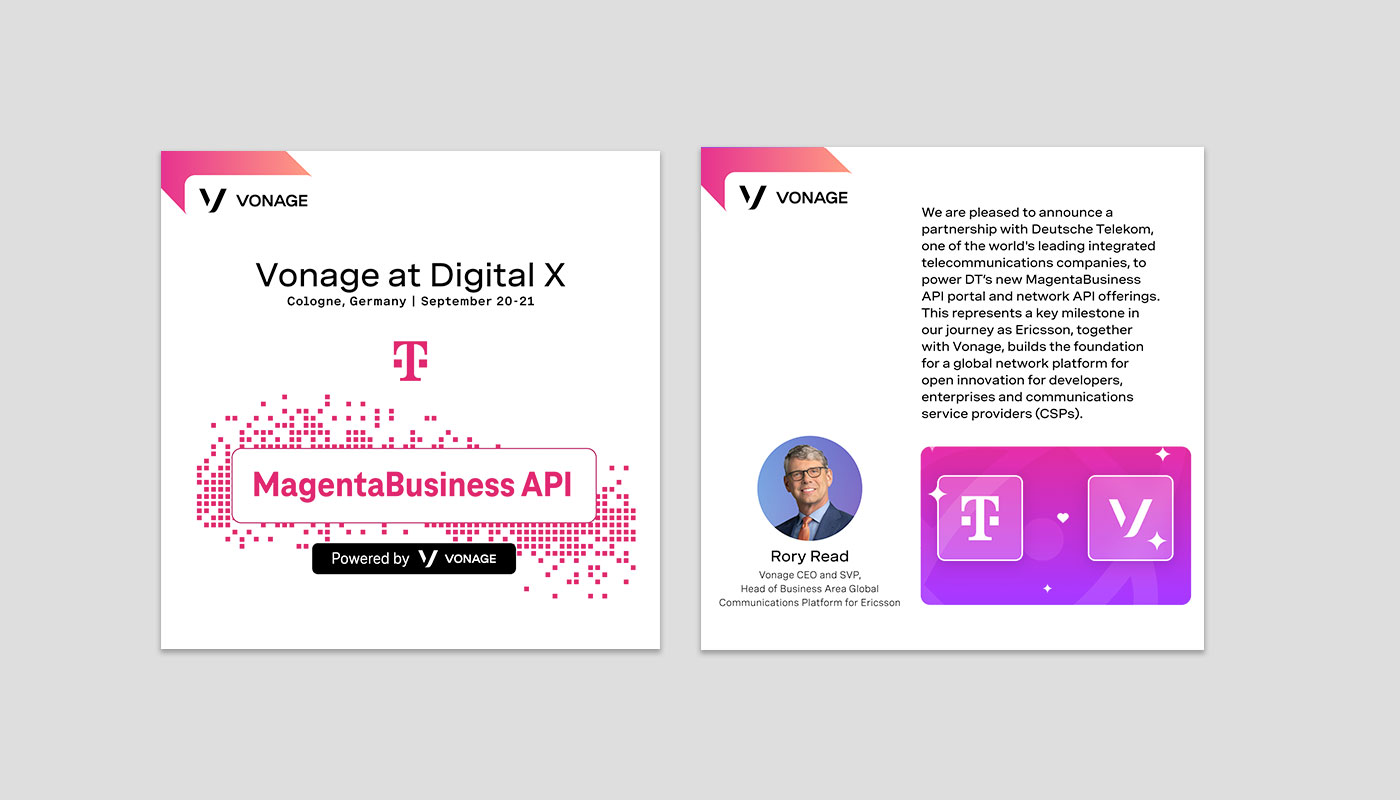 Vonage’s acquisition by Ericsson set off a fast and furious workstream to launch APIs powered by Ericsson’s 5G Network. Our first Network API resell partner was Deutsch Telecom and we announced the partnership at Mobile World Congress and then followed up by attending Digital X with them shortly after, to show the world what a Vonage powered API portal can do. Here is a sampling of cobranded work created for DT and Vonage’s use surrounding those events.