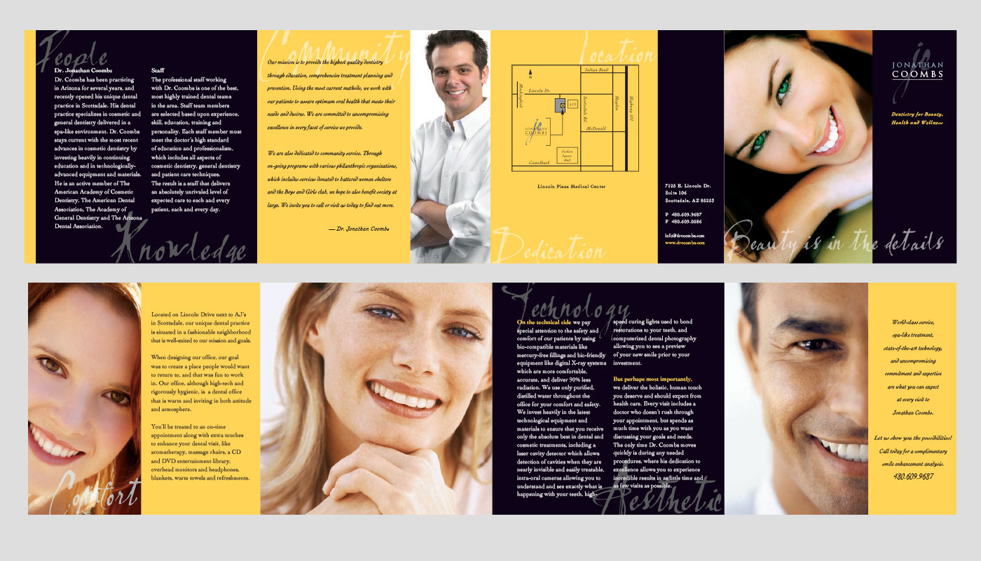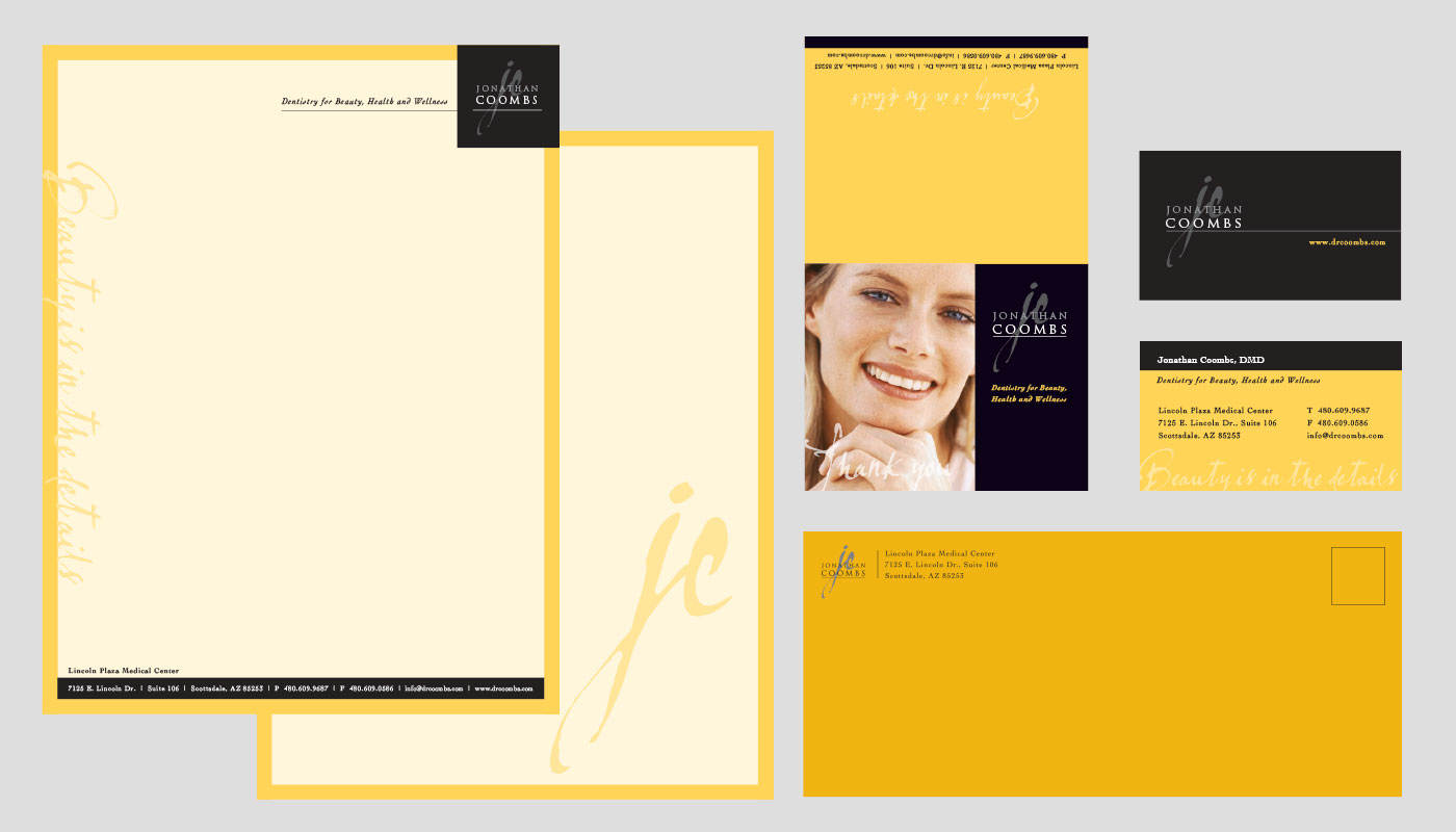 Jonathan Coombs came to my firm needing an identity system, thank you cards and brochure that utilized his logo and coordinated with the website he had already had created. He wanted everything to have a very upscale feel as his practice primarily performed high-end aesthetic dentistry. His four fold brochure was utilized as a hand out in his practice for clients that wanted to refer others as that was his primary source of new customers.